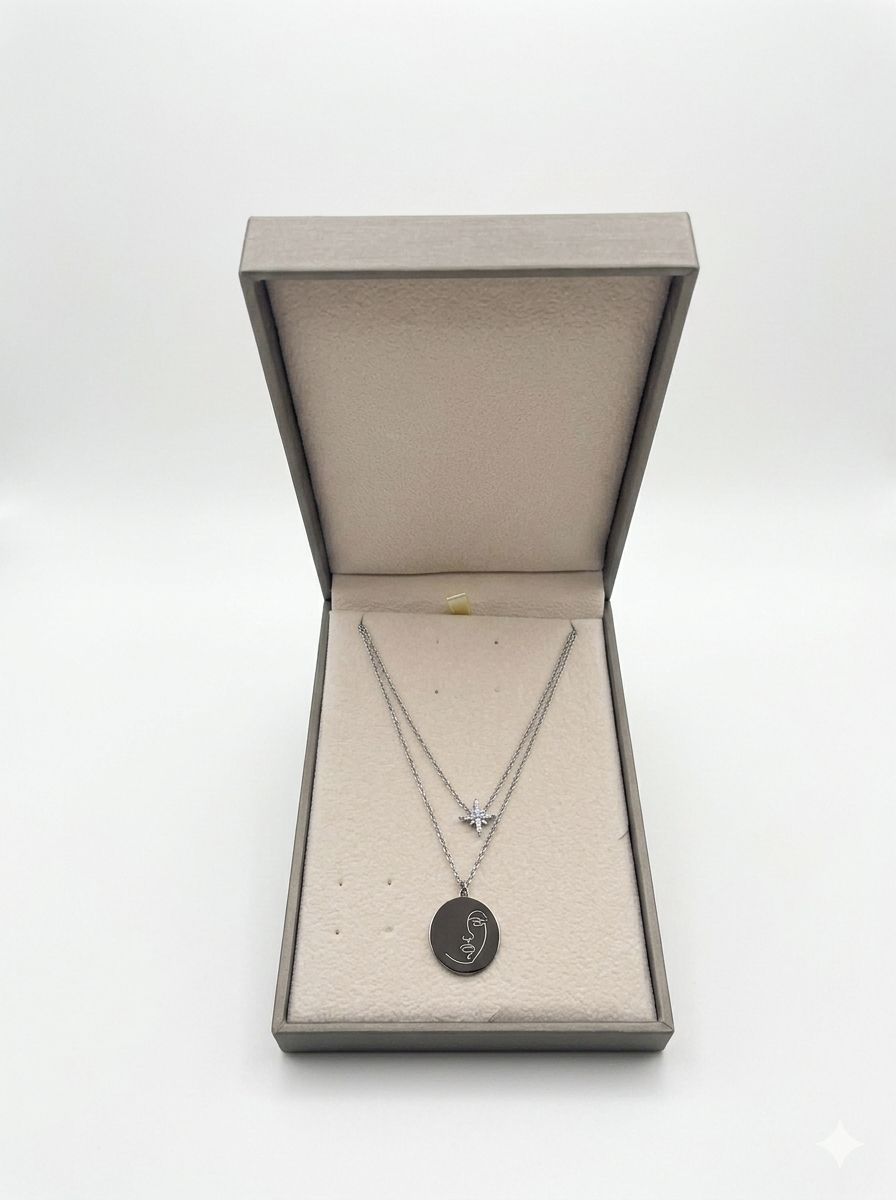 Praticidade Por ser um colar duplo integrado, evita que tenhas de combinar várias peças separadas, garantindo que os pendentes fiquem sempre à distância certa um do outro.