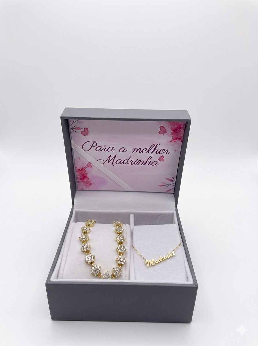 Apresentação Emotiva O conjunto é entregue numa caixa premium cinzenta que inclui um cartão decorativo com flores rosas e a mensagem dedicada: "Para a melhor Madrinha".