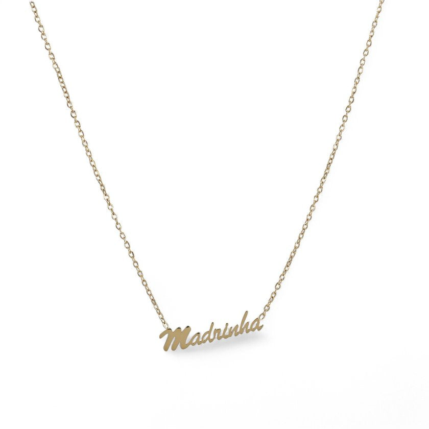 Colar Personalizado O colar exibe a palavra "Madrinha" escrita numa elegante fonte cursiva, suspensa por uma corrente fina e delicada, simbolizando uma ligação eterna.